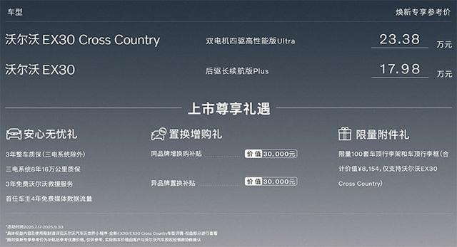 2025年7月17日,沃尔沃EX30 Cross Country(以下简称沃尔沃EX30 CC)正式上市,新车作为沃尔沃EX30的跨界越野版本,以23.38万元的焕新价切入小型纯电SUV市场,用独特的产品哲学重新定义都市轻越野的边界。同时,还推出了焕新专享参考价17.98万元的沃尔沃EX30后驱长续航版Plus,不过上述限时权益时间仅截止到2025年9月30日。